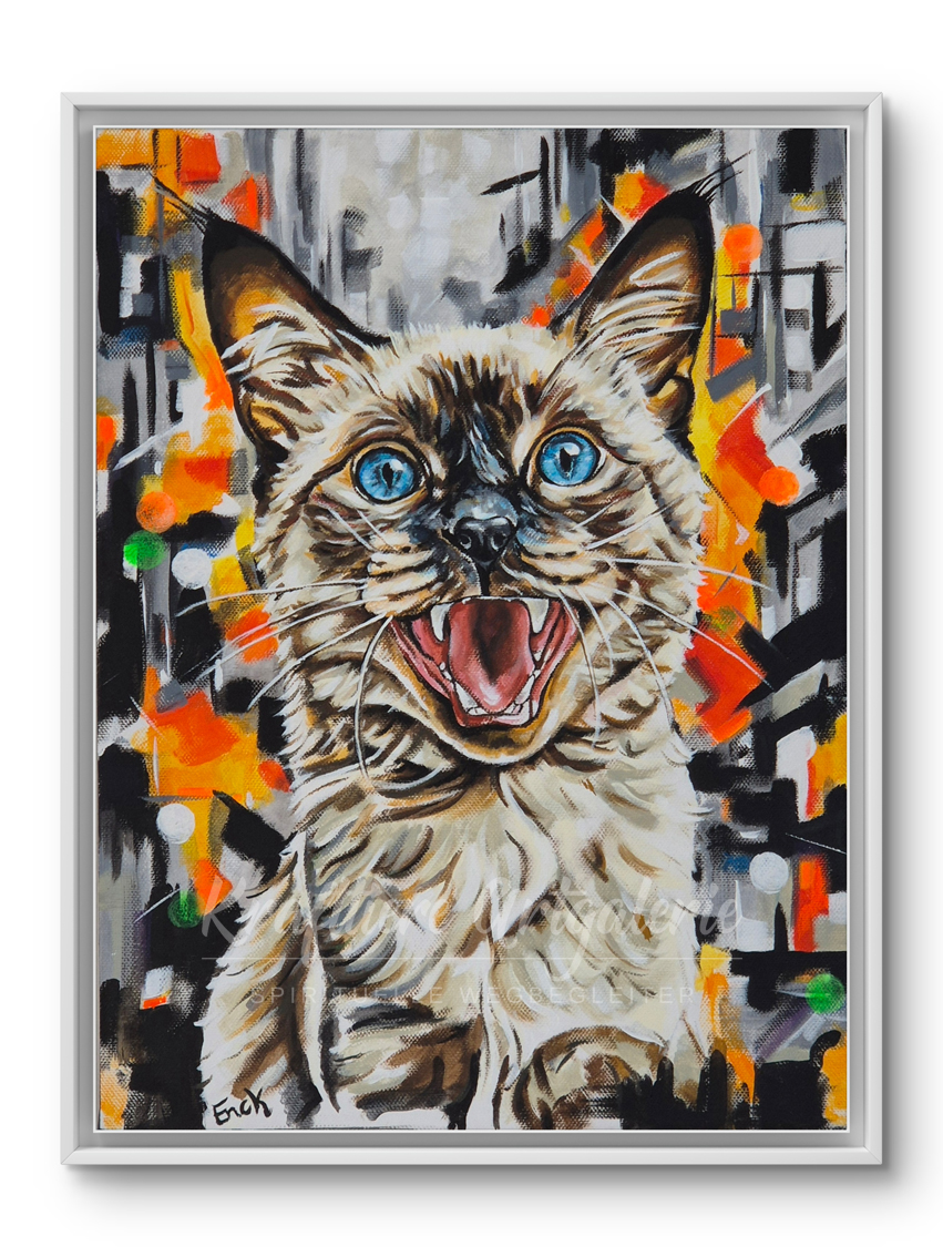 Diese Serie entstandt für eine Ausstellung in einer Tierarztpraxis. Sie rückt beliebte Haustiere wie Hunde, Katzen und Kaninchen in ein lebendiges, urbanes Licht. Mit kräftigen Farben und comichaften Akzenten werden die Tiere zu den farbenfrohen Bewohnern der modernen Großstadt.